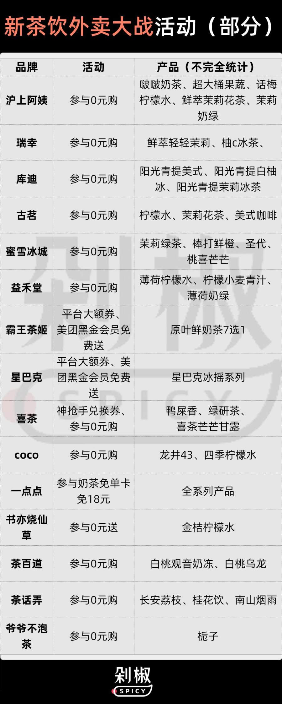 而拉长时间线,从剁椒Spicy汇总的第三季度茶饮品牌的外卖大战参与程度来看(“外卖大战”已烧掉250亿,谁赚到钱了?),瑞幸、库迪与古茗均加入了“0元购”阵营,但三者的参战策略存在区隔。
