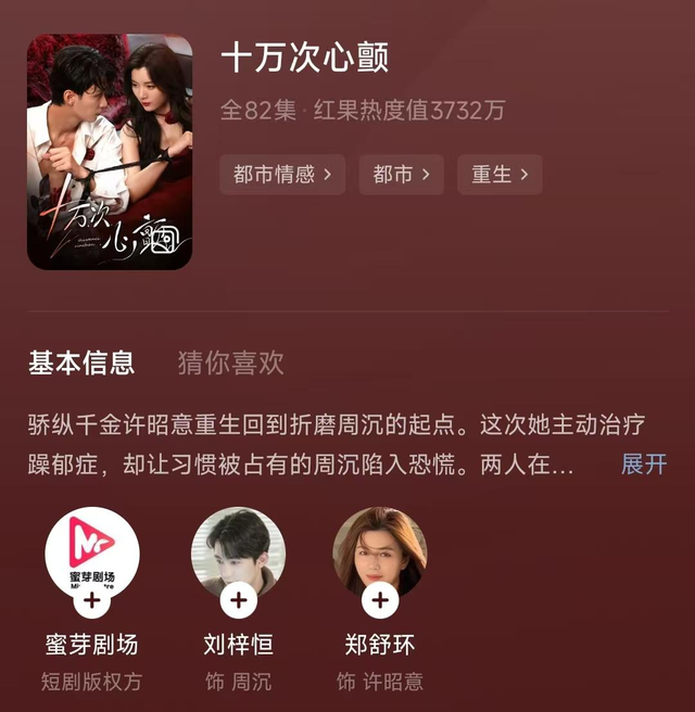 《十万次心颤》改编自小说《玩弄阴湿反派后,他离不开我了》,是同部小说改编的第三版短剧,一共82集。快手累计播放量1.8w,截止8月1日,该剧红果热度值最高达到3828w,收藏量为8.2万。