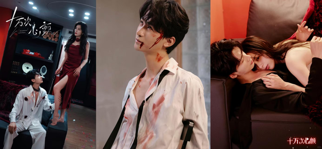 男主的战损妆一直贯穿全程,从细微的伤口结痂到沾染血污的衣衫,用“破碎感”强化了男主的娇弱;女主的红裙妆造也很亮眼,热烈的红色将躁郁症带来的极端情绪用视觉的效果呈现出来,更具冲击力。