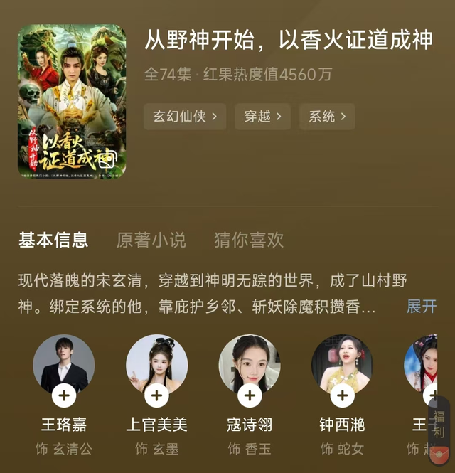 《从野神开始,以香火正道成神》改编自小说《从野神开始,以香火证道真神》,一共74集,累计热力值为16.9w。截止8月1日,该剧红果热度值最高达到4560w,抖音端原生累计播放量为8.1万,快手热播累计播放量为11.5万,收藏量为17.6万。