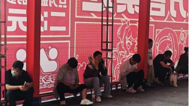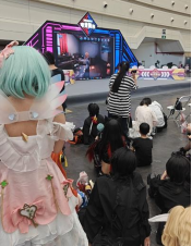 烈日将地面晒得发烫,场馆外几位陪子女前来漫展的家长靠在广告牌下乘凉,不时用宣传册扇风。有的coser独自站在队伍外围,踮脚张望着,等待迟迟未到的同伴。