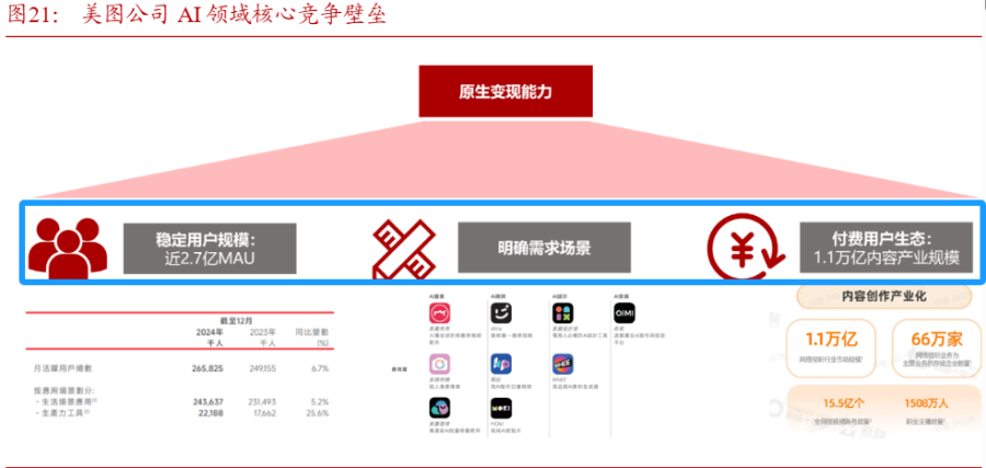 美图、快手和 MiniMax这几家公司的创意工具类产品,都证明了这一点。花旗认为快手可灵AI的商业化进程超预期。而中金也预计,美图在付费渗透率和用户增长的双轮驱动下,2025年订阅收入同比增长超40%。
