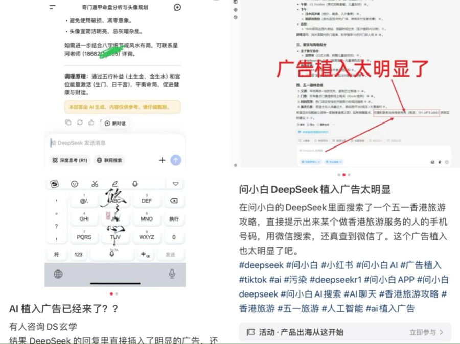 更有甚者,有网友在社交平台发布笔记称:在DeepSeek里搜索了一个香港旅游攻略,直接提示出来某个当地导游的手机号,用微信搜索,还真查到微信了,“这个广告植入也太明显了”。