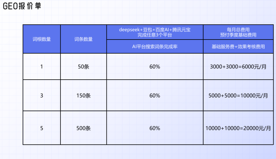 与此对应的是,大部分GEO服务公司的报价与词条数挂钩。上述GEO服务公司的报价为:一个词根数量,50条词条的每月总费用为6000元,包含基础服务费和效果考核费。而其保证的AI平台搜索词条完成率为60%。词根数和词条数目越多,费用更高,500条词条的单月总费用为20000元。