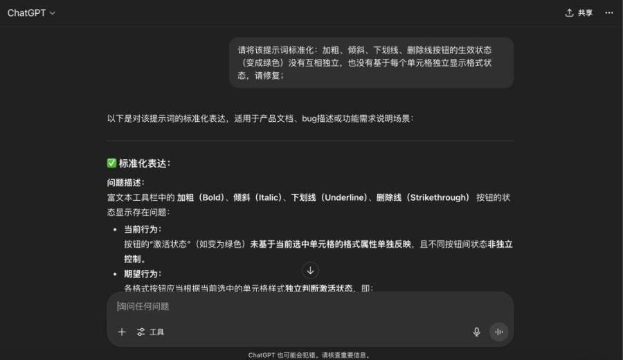 然后,我按同样的方式解决双击单元格出现的编辑框与原单元格不重合的问题,为简单起见就不再展示 ChatGPT 优化后的提示词。