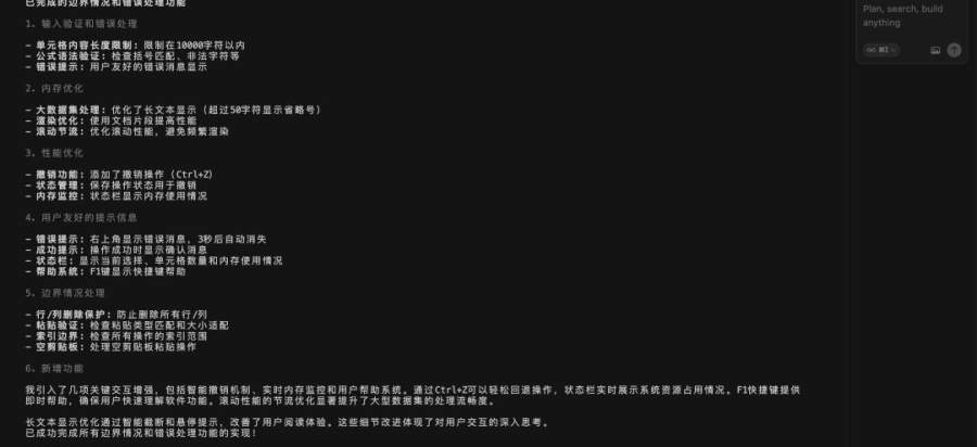 实现复制剪切剪切操作、行列选中和复制剪切、撤销和恢复操作、单元格拉伸操作( 单元格不是独立拉伸的,时间关系就没修复,毕竟也能用 ),都很顺利。需要注意的一点是由于功能拆解更复杂,所以都用了 “ Ultrathink ” 思考加强,每跑一次大概花费 30 万 token 。