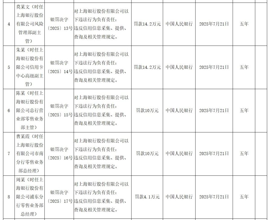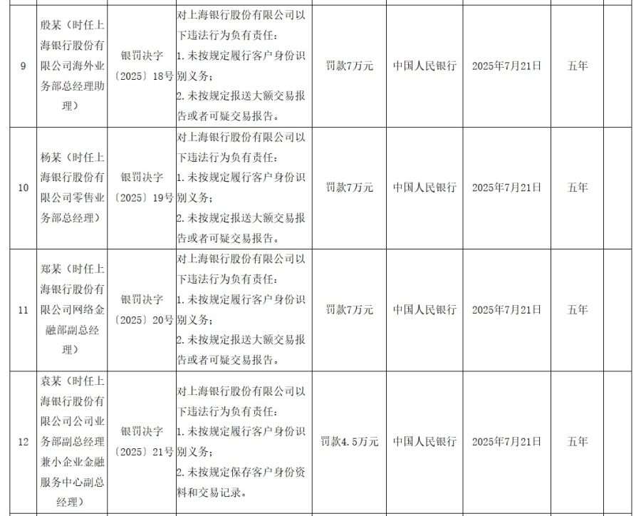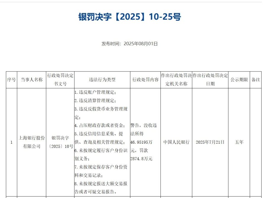 2025年7月21日,中国人民银行对上海银行及其相关责任人员作出行政处罚决定。