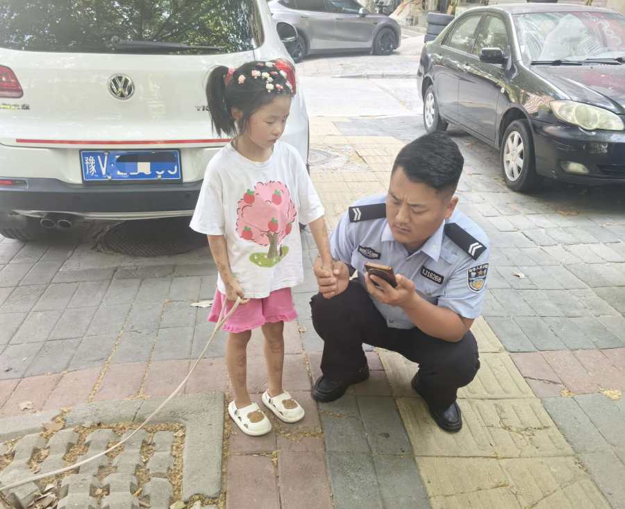 8月1日中午,烈日炎炎,中牟县公安局交警大队铁骑中队辅警王跃在上班途中发现一名小女孩独自蹲在路边哭泣,怀里还抱着一只小猫,神情无助。王跃立即上前询问,但小女孩警惕性很高,始终不愿意开口,察觉到孩子可能因害怕陌生人而沉默,王跃灵机一动,返回离的不远的单位换上制服,并叫上同事朱坡松一同上前。