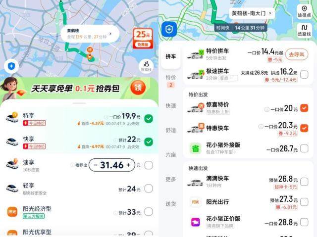 打开主流叫车软件,滴滴“特惠快车”的价格往往比普通订单价格低30%左右。以武汉市区订单为例,普通快车费用约27元,而特惠快车仅需20元左右。