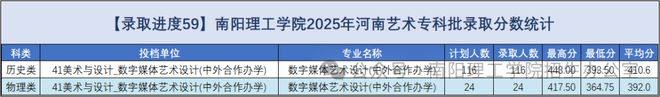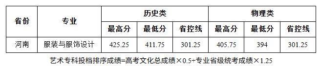 2025年,学校在河南省艺术类专科计划招生160人,实际录取160人。其中数字媒体艺术设计80人,艺术设计专业80人。男生41人,女生119人。汉族160人。共青团员17人,群众143人。各专业录取情况见下表。