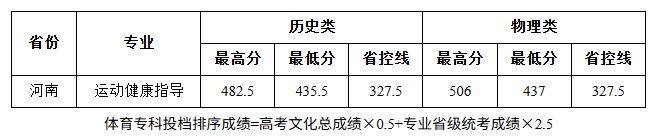 2025年,学校在河南省体育专科计划招生160人,实际录取160人。其中物理类计划60人,历史类计划100人。男生144人,女生16人。汉族155人,回族2人,蒙古族2人,侗族1人。共青团员36人,群众124人。各专业录取情况见下表。