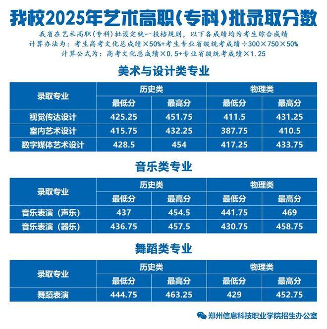 备注:根据河南省艺术专科平行志愿投档规则,综合成绩=文化成绩×0.5+专业成绩×1.25;综合成绩保留两位小数后仍相同的,依次按考生专业省级统考成绩、语文数学两科之和、语文或数学单科最高成绩、外语单科成绩、首选科目单科成绩、再选科目单科最高成绩由高到低排序投档。