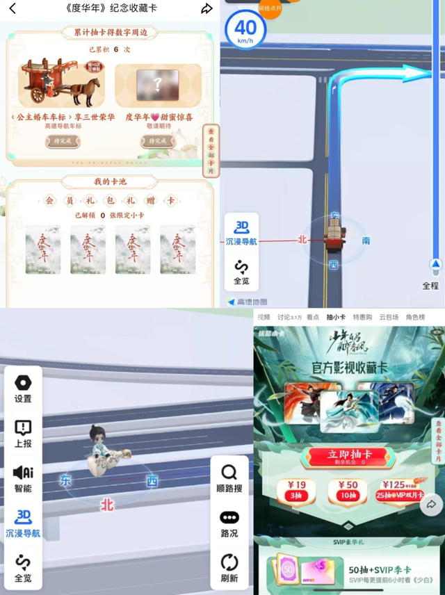 例如,在高德地图的“角色车标”活动中,平台为《度华年》《少年白马醉春风》等剧打造了专属语音与视觉导航皮肤,角色以“公主婚车”“酒葫芦坐骑”等造型进入用户的出行场景,成为高德端内的情绪陪伴物件,实现场景延展。