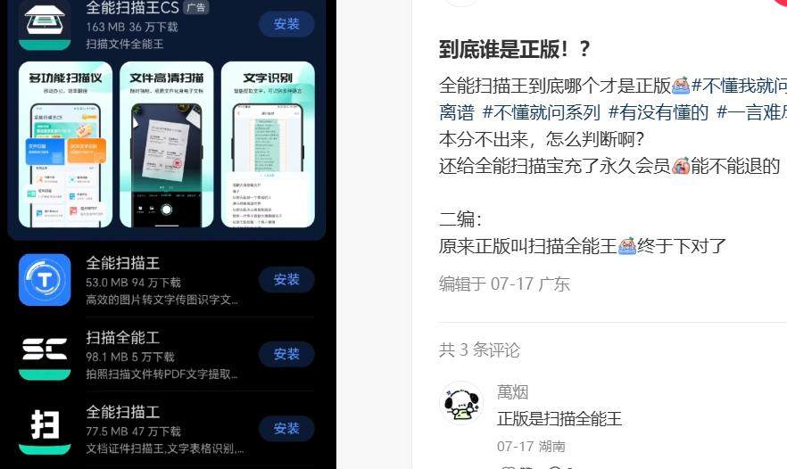 同时,扫描全能王还面对“山寨”“盗版”产品的侵袭。手机应用商店里有多个和“扫描全能王”的名称及logo都高度相似的“山寨”应用,使得不少用户被误导;合合信息倘若不予以维权治理,长期下来也会对口碑形象和用户体验造成影响。