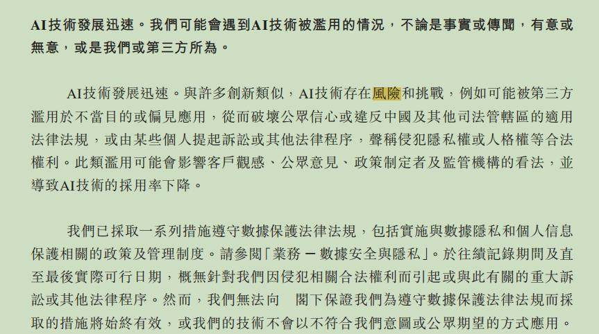 今年向港交所提交的招股书中,合合信息也提到了相关风险。合合信息表示,“我们可能会遇到AI技术被第滥用的情况”,为此,公司采取一系列措施遵守数据保护法律法规;然而合合信息也坦诚表示其无法保证为遵守数据保护法律法规而采取的措施始终有效。
