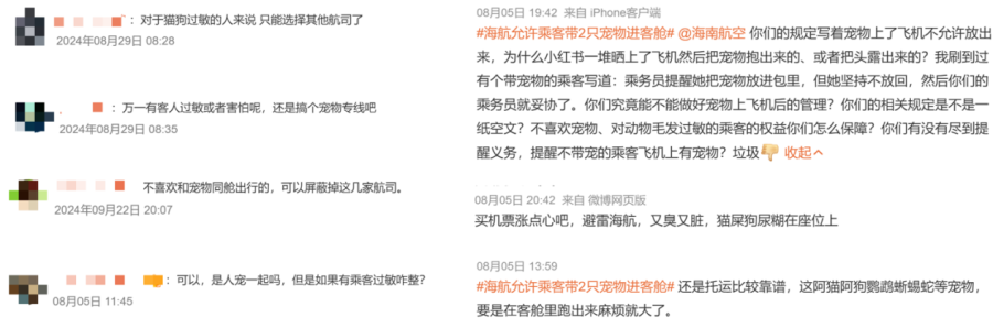 海航推出的“一人两宠”服务虽为多宠家庭提供了便利,许多网友也对于此项服务的实施表示反对。他们认为这侵犯了同程乘客的利益,并且带宠物进入客舱可能会引发一些乘客的过敏反应。而此类讨论在相关新闻下一直存在: