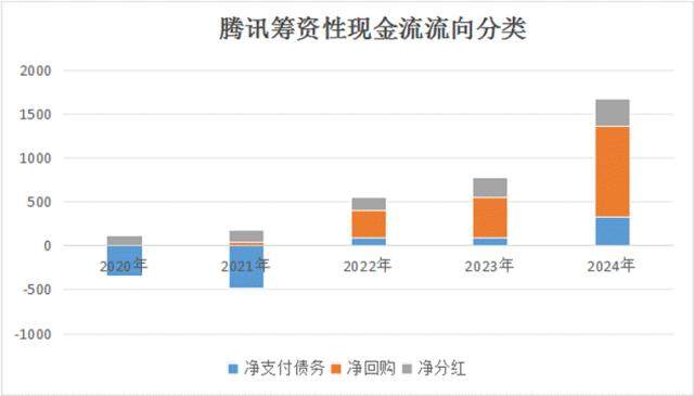 在过去5年中,腾讯的账面资金正在积极的回馈股东,回购+分红+偿债金额逐年上升,在2024年,腾讯回购分红和偿债的净总金额达到了1681亿,已经是当年资本开支的2倍还要多。
