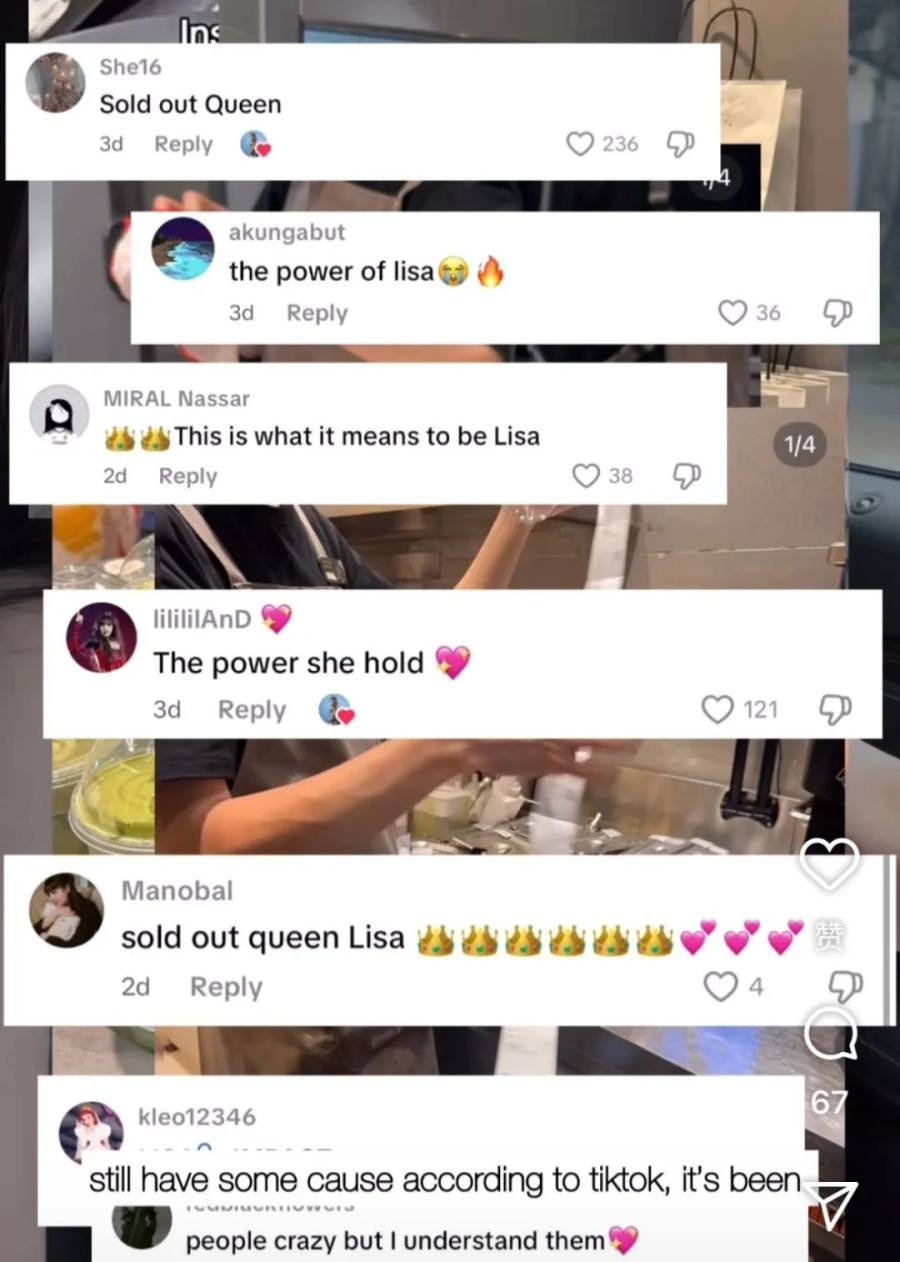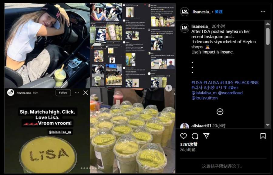 海外市场也一片热闹。喜茶快速在lisa评论区进行认领,喜茶ins官方账号在lisa帖子下评论“HEYTEA in hand. Lisa in frame. We love Queen Lisa too!”。此后,喜茶美国、英国、韩国、澳大利亚等多地海外官方账号均对这张照片进行转载,甚至美国区喜茶官号还专门po出了带着“LISA”字样的厚抹茶进行回应。在发现“三倍厚抹”售罄后,国外网友纷纷表示“带货女王lisa”“这就是lisa的力量”“人们很疯狂但我能够理解”。
