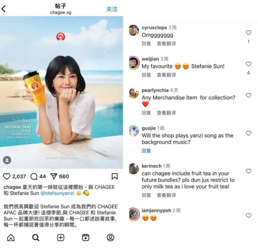 2025年,霸王茶姬便在孙燕姿举办《就在日落以后》演唱会后,官宣她为亚太地区代言人。在霸王茶姬新加坡ins官方账号下,不少网友对孙燕姿排队示爱。