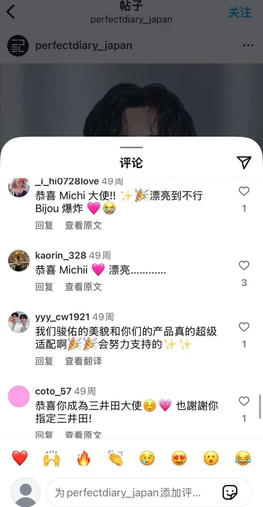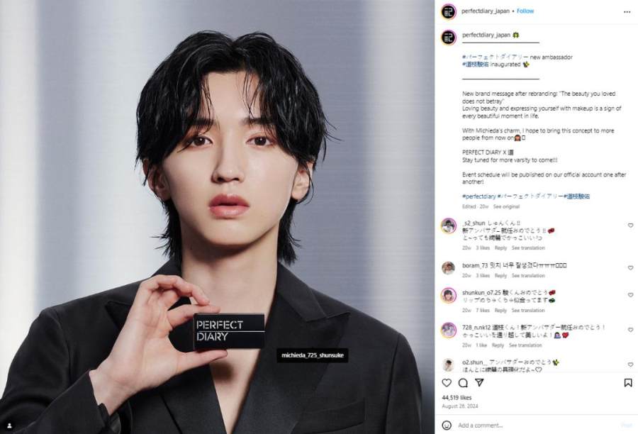 同样,2024年完美日记出海日本时,选择“千年一遇美少年”道枝骏佑作为代言人,在完美日记ins账号的官方视频下,大量日本网友发出“道枝骏佑的美貌和你们的产品很适配!”的称赞。