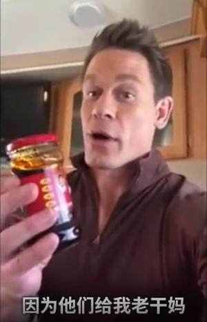 美国演员约翰·塞纳也曾在视频里疯狂表白“老干妈”,他一边吃西餐一边拿老干妈拌西兰花,最后还很认真地说:不是广告。