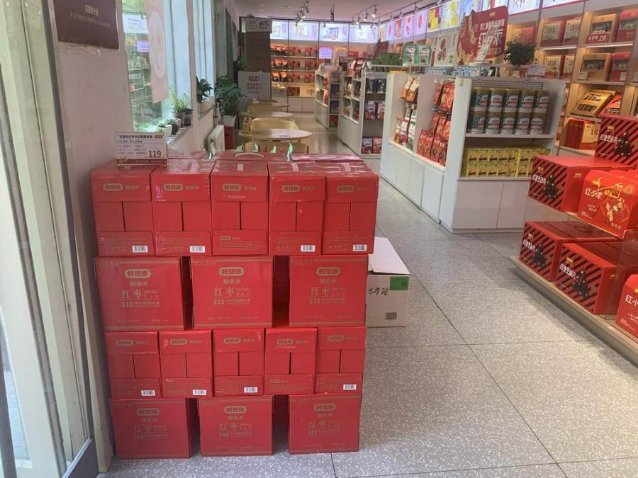 在北京万寿路的好想你轻养生活馆里,大约有20箱名为“报喜酒”的中式精酿啤酒摞在进门口一侧。该门店工作人员告诉蓝鲸新闻记者,一般厂家会要求各直营店将新品或热销品放在门店较显眼的位置。