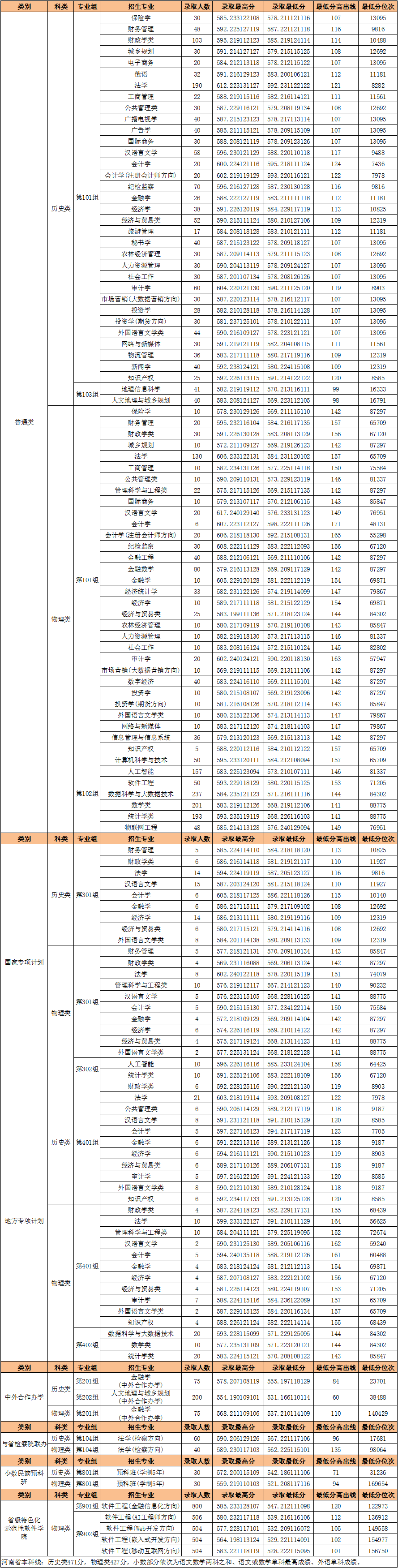 河南财经政法大学2025年河南省普通本科批次投档录取情况一览表