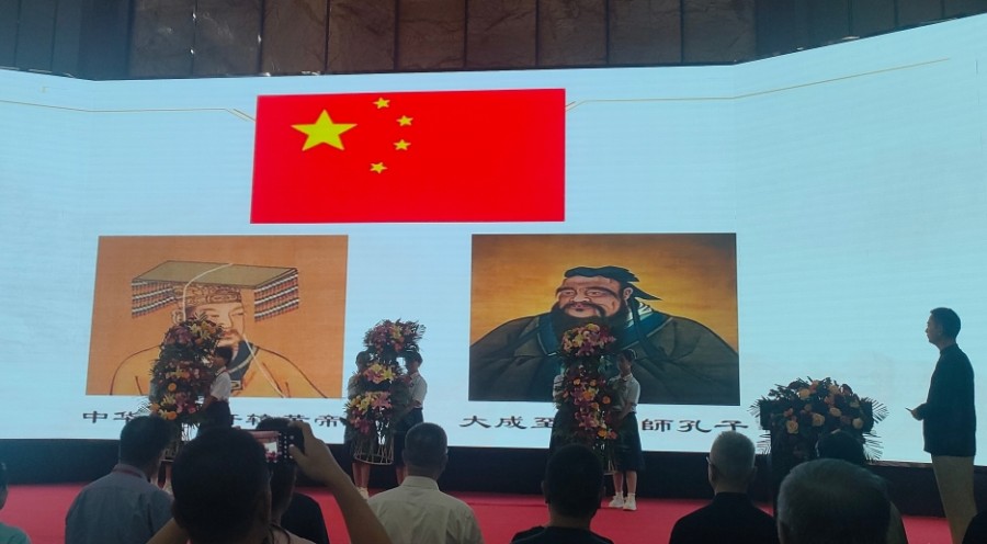 在庄严的国歌声中,本次论坛活动正式拉开帷幕,首先由学子们为祖国,为赫赫先祖和大成至圣先师敬献花篮。伴着《黄帝颂》优美动听的音乐,学子们步履缓慢地将花篮放置在指定位置,以表爱国之情、敬祖之意,以真诚礼敬至圣先师,全体与会人员肃整衣冠,行三拜礼。