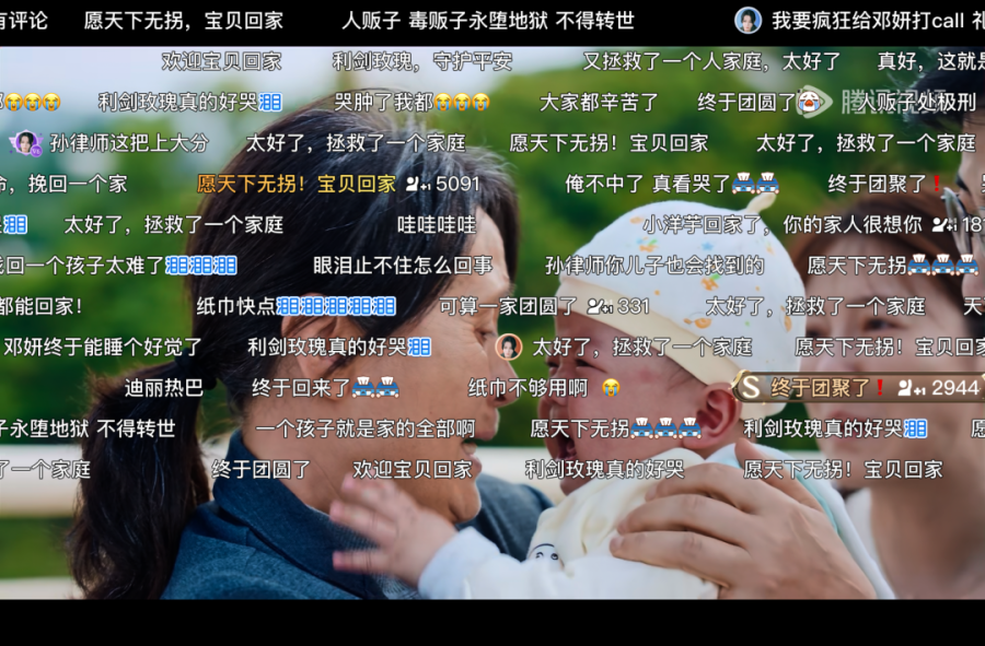 弹幕上,“孩子不是商品”、“支持买卖同罪”、“愿天下无拐,宝贝回家”等带有强烈情感浓度的弹幕时不时刷屏。