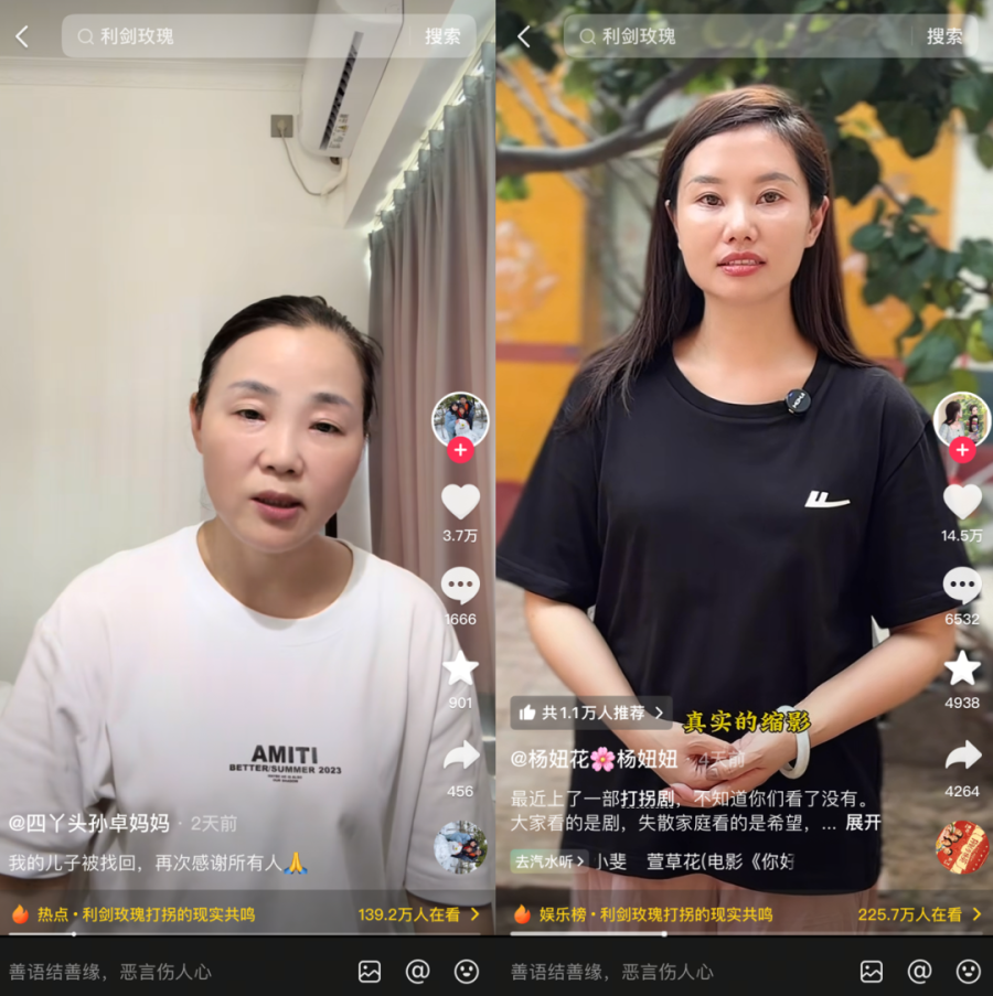 另外在抖音,《利剑·玫瑰》官抖发起的“宝贝回家计划”,参与人数已有上万人。情绪不断蔓延的过程中,历经14年寻回儿子的孙卓妈妈在抖音发视频推荐《利剑·玫瑰》。有着相似被拐经历的杨妞花看到该剧同样深受触动,她在分享的视频中直言:“《利剑·玫瑰》不只是一部打拐剧,更是无数破碎家庭真实的缩影。”触动了无数屏幕内外观众的心。截至目前,该视频累计点赞量已突破14万。