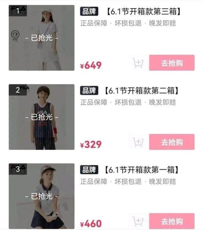 当天,直播间一共上架了三款商品,这三款商品均属斐乐旗下,定价分别为329元、460元及649元,上架后很快被抢空。