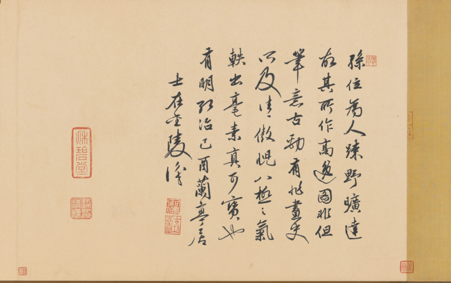 收藏印:宣和、政和朱文连珠印记,御书、政和、宣和、睿思东阁、双龙朱文印记,梁清标、清内府诸收藏玺。