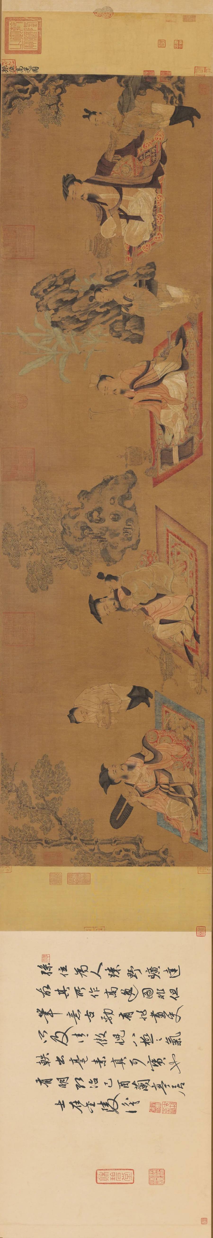是卷所绘,高士四人,各据毡席而坐,衣冠制度悉依两晋六朝之制,非唐世流行之貌。有长髯披胸,广额沉思,垂袖正襟,似聆林外松风。其前童子执物而立,微躬如侍。有怀琴抱膝,侧首低眉,若闻音声自心间出,炉烟袅袅,香气与竹影交融。有高士披朱衣,襟带宽博,手执羽扇,面向幽林,神情旷远,似见山外之水流云散。有披紫裳者,倚几而坐,身姿稳重;童子侍后,执琴抱鼓,若候知音之唤。