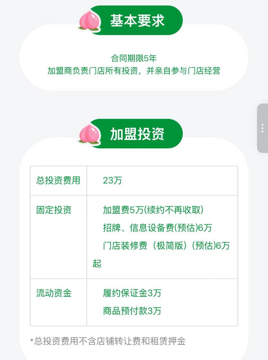 据百果园官方网站信息,百果园加盟的总投资费用在23万元左右,其中包括加盟费5万,招牌、设备信息费6万,门店装修费(极简版)6万起等固定费用,还包括商品预付款3万和履约保证金3万。