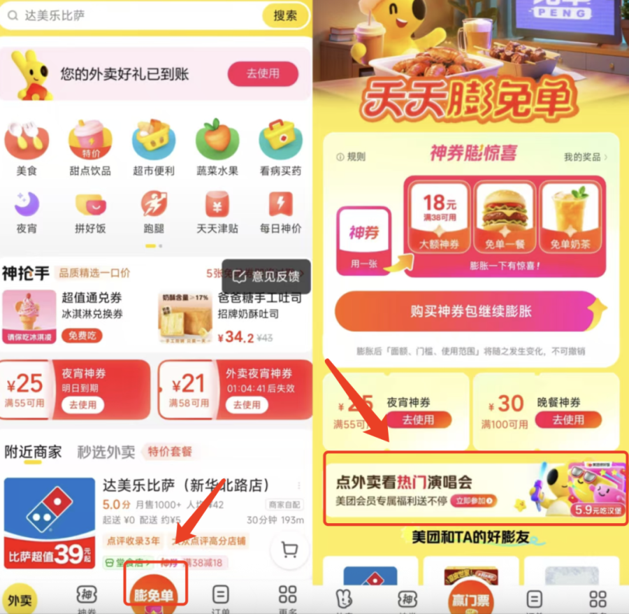 据“天天膨免单” 活动介绍显示,除常见的外卖膨胀券外,更有 “点外卖得演唱会门票”“吃外卖见麦迪”“下单得电影周边” 等特殊策划。