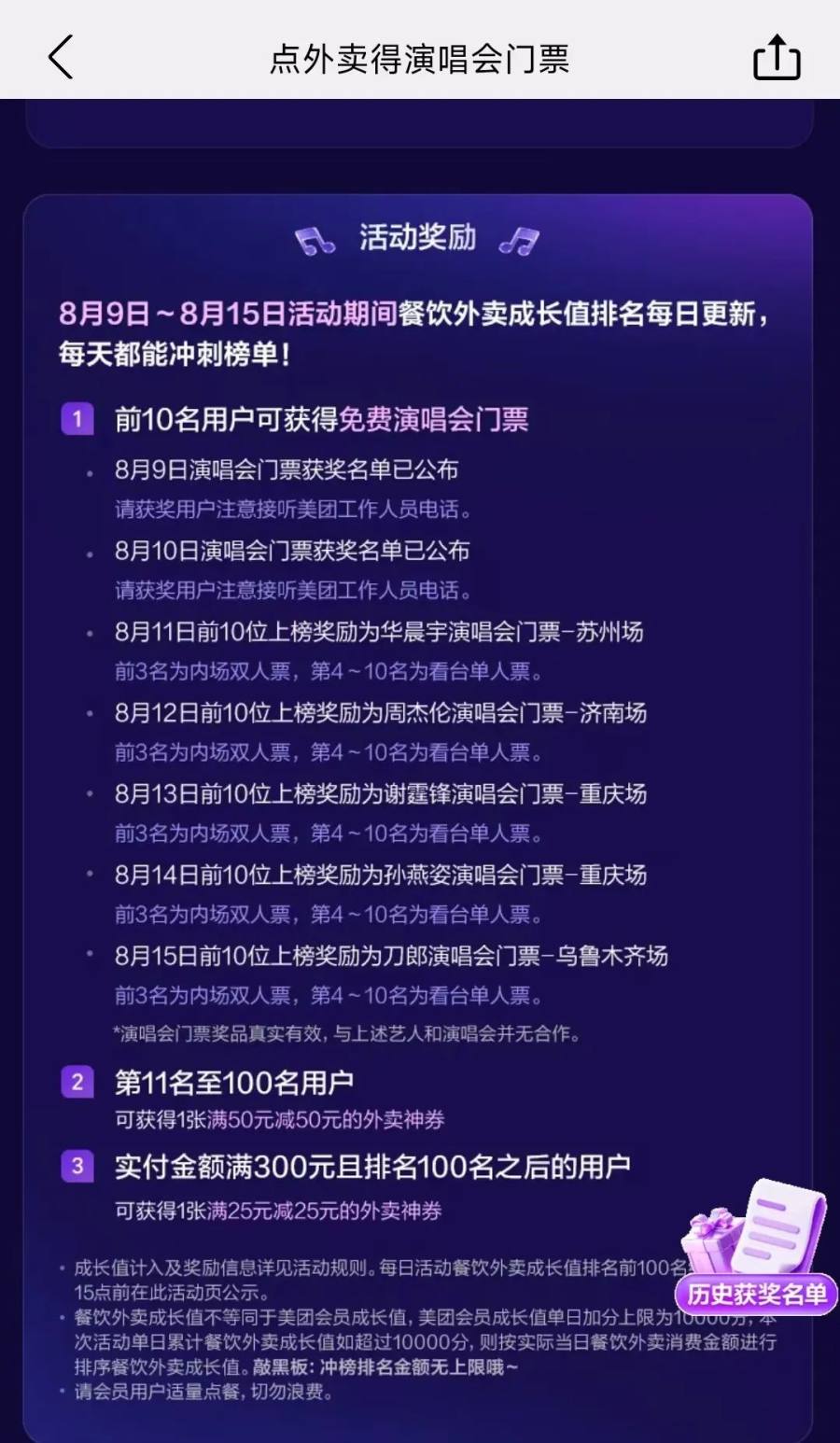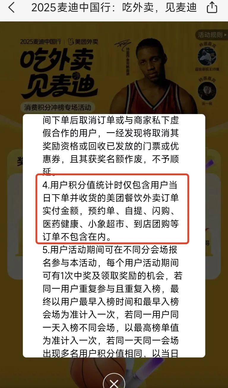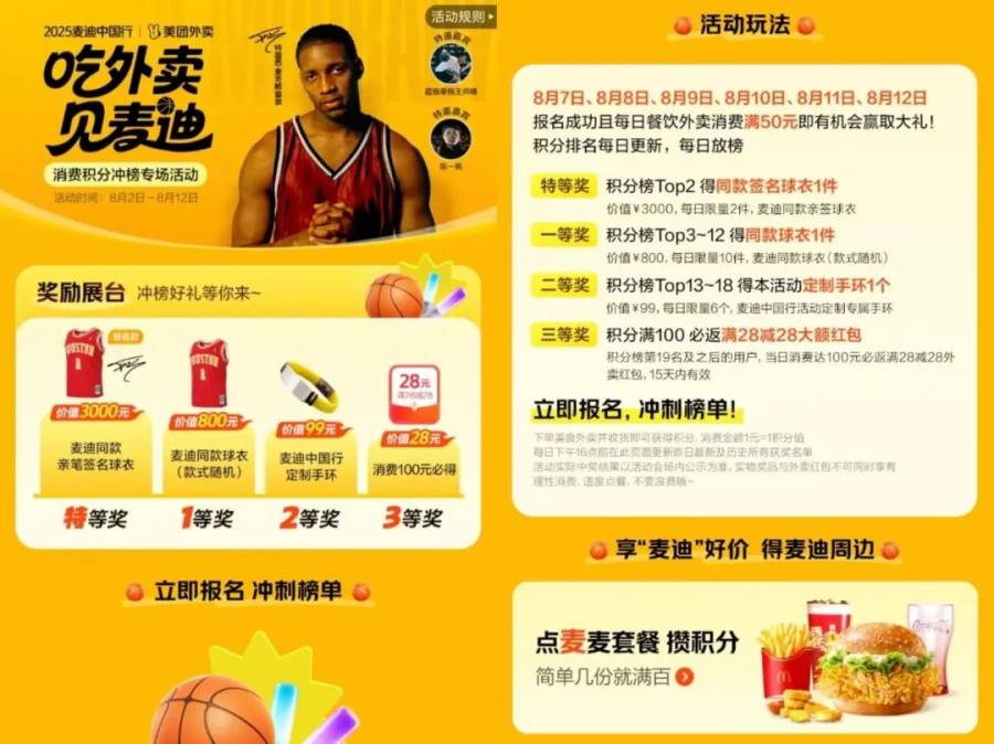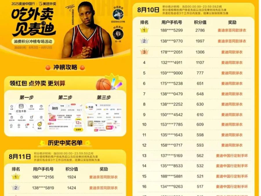 比点外卖送演唱会门票更早的打榜活动,是美团外卖与2025麦迪中国行合作的“吃外卖见麦迪”消费积分冲榜专场活动。
