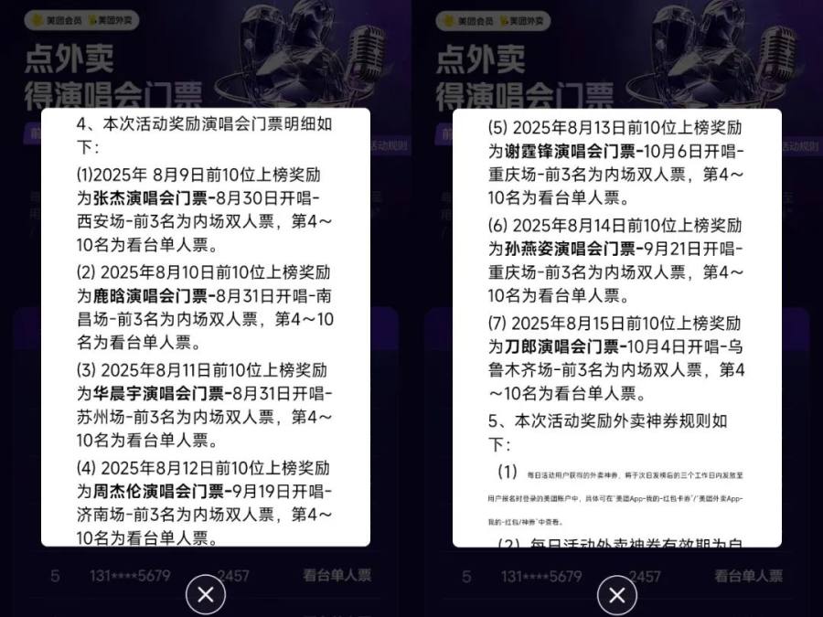纵观美团外卖针对美团会员推出的“点外卖得演唱会门票”活动,其中,一等奖1-10名,奖品为热门演唱会门票,共计包含了七场8-10月的热门演唱会,分别是张杰、鹿晗、华晨宇、周杰伦、谢霆锋、孙燕姿和刀郎演唱会。
