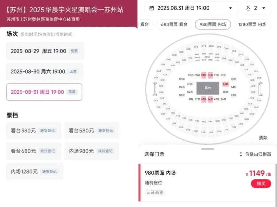 以这场8月31日的华晨宇苏州演唱会门票为例,综合各大演唱会售票渠道价格来看,该场演唱会门票内场票价最低为单张980元,当前已经大规模售罄。而在二手票务平台上,该票价显示为单张1149元。
