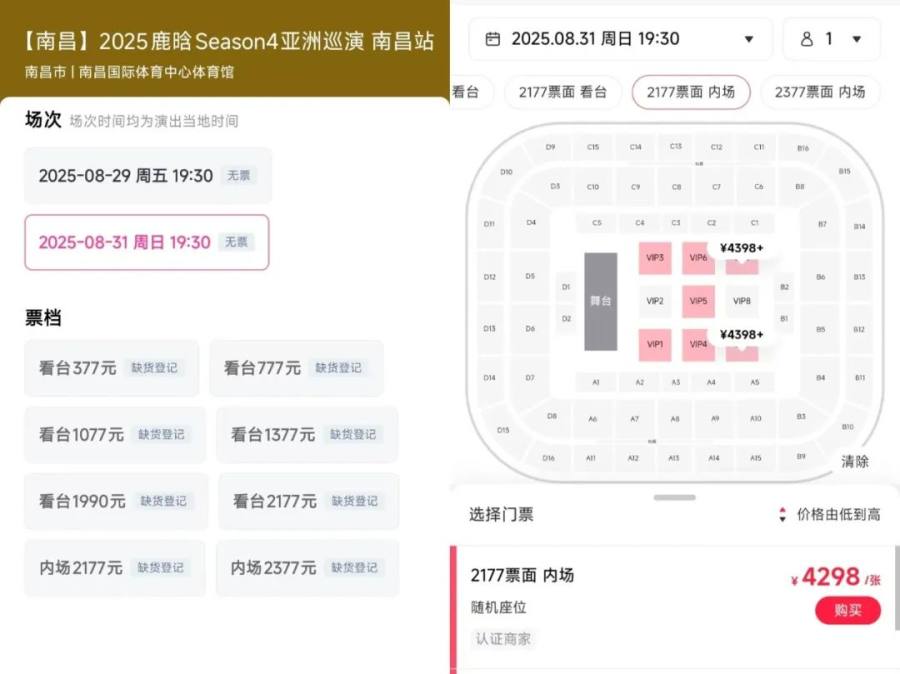 比如,8月10日打榜成功的用户,就以3770元拿下了8月31日鹿晗南昌演唱会的两张内场门票,单张门票价格为1885元,而该场演唱会门票的发售价为2177元、2377元,当前市场上溢价已经达到4298元一张,该用户相当于低于原票价买到了内场门票。