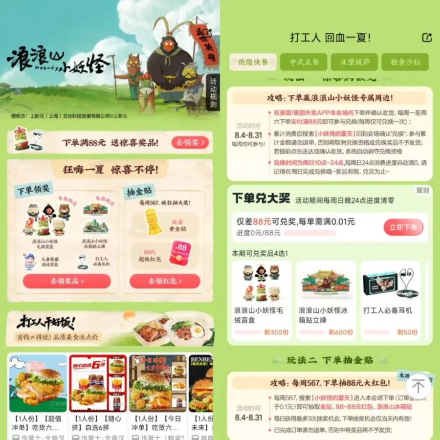 具体来说,每周一至周六在美团外卖“小妖怪的夏天”会场界面下单并实付满88元即可参与兑换,每周仅可兑换一次;其二是下单抽金贴(市场价在70元左右)以及满88-88元红包、浪浪山冰箱贴,该活动仅限每周五、六、日三天,单日抽奖次数最多为3次。