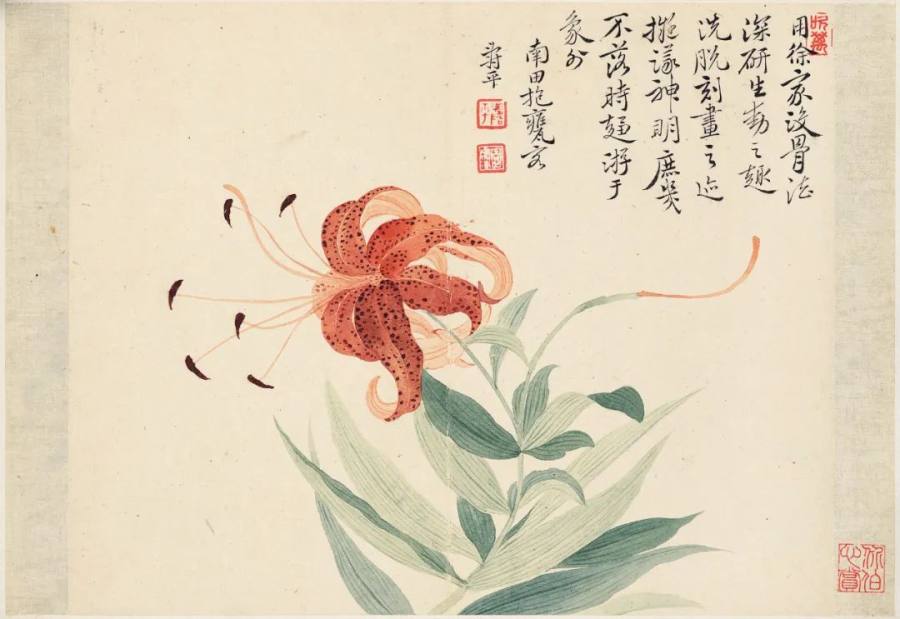 卷丹本名百合一类,俗园常见;入恽公手,顿换神宇。此幅足供案头赏鉴,亦可入课堂为范:观法先取整体气息,再察笔路设色,终寻兴寄。题目端简,三段并列,纲目在前,读友易循;词句文雅,尺度端庄,适合推送与收藏。愿凭一页清芳,涵养身心;屏前对览,晨夕不倦;春夏相随,心境常新。