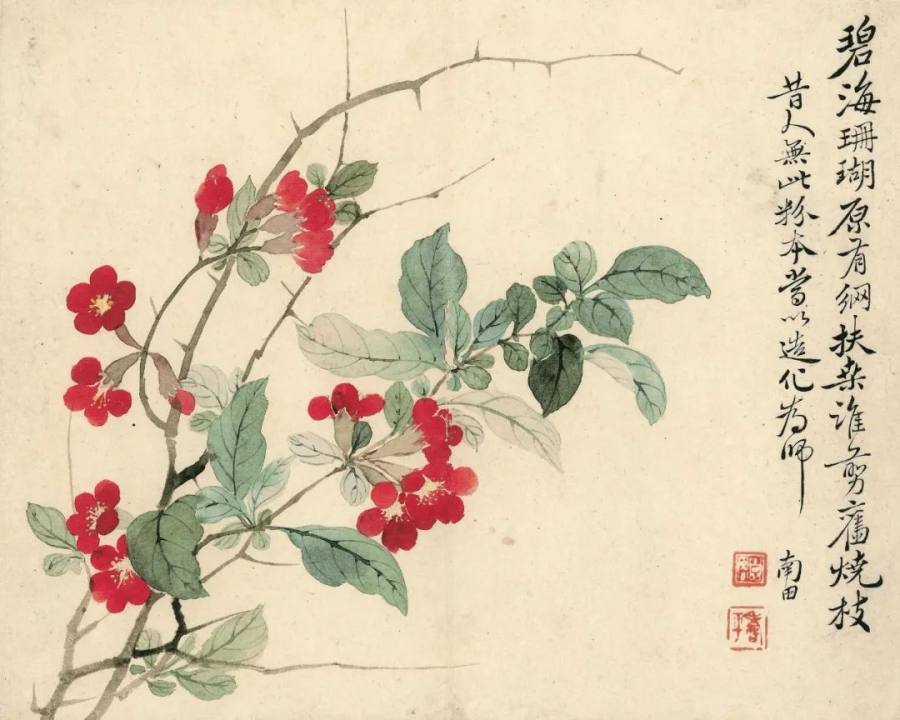 南田写生,本取自然。命名碧海珊瑚,寓海棠英华,照人如火,寒枝亦生春心。宋词善写红怨与清欢,移入花史,便成一阕:小院风轻,露痕初落;粉腮临水,影碎沙明。此幅涵恽寿平家法,归入瓯香馆写生册,花鸟南宗与没骨设色并举,格律谨严而气息灵动。推送宜题“珊瑚映海棠·南田没骨范式”,首屏配局部高晰,内页分解设色与用笔要点,关联关键词恽寿平、瓯香馆写生、碧海珊瑚、没骨设色、花鸟南宗、海棠红,读链由画入法,由法入心,传播可久。
