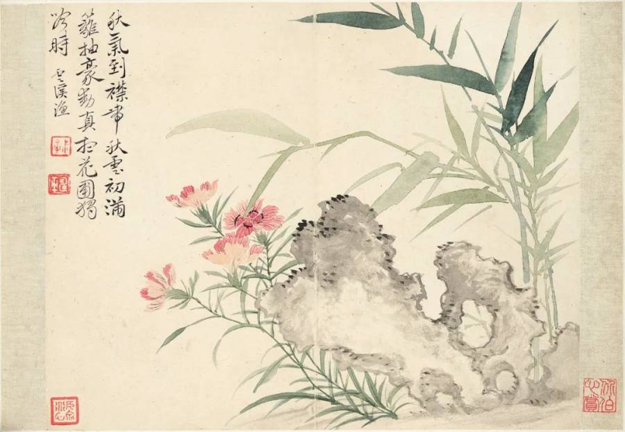 风骨疏朗,墨彩清润,洛阳花枝横斜石畔,浅红新吐,瓣卷如霞。翠竹修篁映于后,叶尖微颤,似应秋声。太湖石瘦皱玲珑,嵌空处留风,嶙峋间蓄意。花叶相倚,墨淡处显空灵,设色处敛华彩,秋气自画面间氤氲,微露湿香,仿佛可入鼻息。此幅布景疏密有度,花石竹影各持其姿,恽寿平以生写之法,不为勾摹之拘,于写实中寓性灵,于清淡处见深情。