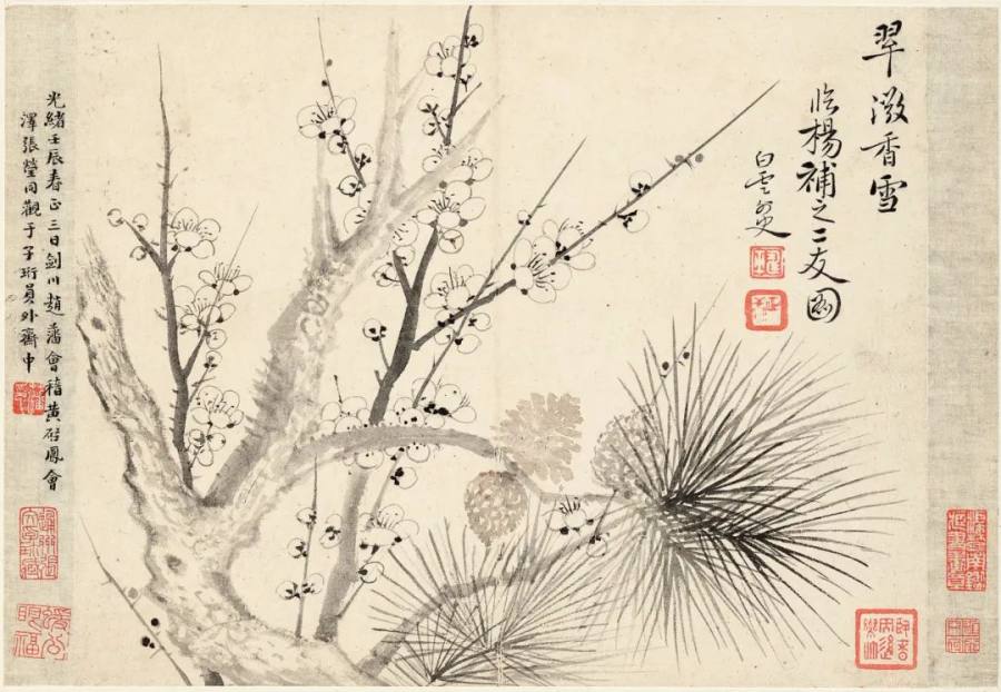 老干盘错,苍皮带皴,裂处透银。新枝数挺,探入晴空,圆瓣密布,黑蕊轻摇,如雪未融。右隅松针成屏,万线如丝,青绿相摄,松果淡赭,含香未吐。前景少草,墨痕疏淡,水意自生。全幅以大留白统摄,寒野开阔,风声在纸外。恽寿平取梅为主,辅以松意,寒两友并立,清气充盈,幽韵入骨。画面不事繁饰而见高致,花木清标,庭院静谧,幽香似从纨素微微透出。