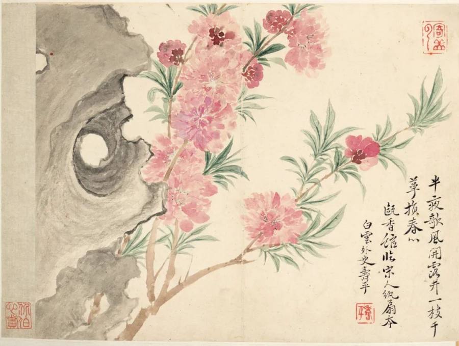 左幅太湖岩挺立,洞眼旋云,墨晕层层,似浪拍崖。中干自石隙抽出,两枝分披,花团相向,粉绛映霞,瓣缘微卷,蕊丝星散。叶作披针,冷翠相叠,风姿婉转。素绢留空如晴天,清气满纸;红、绿、灰三调互照,春光由浅入深。画面不设栏槛,不置亭宇,唯以岩与桃对语,刚柔相参,静处含动,观者心肺自清。
