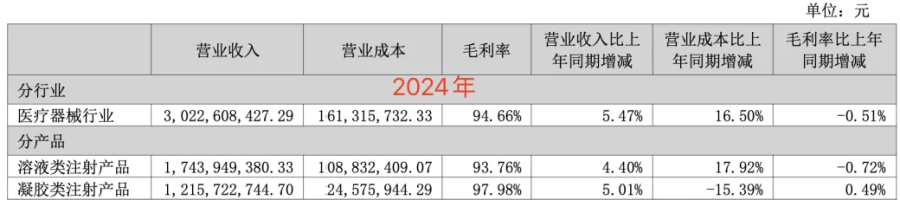 爱美客发布的2024年报显示,以童颜针“濡白天使”为代表的凝胶类注射产品全年营收达12.16亿元,占公司总营收的40.18%,较上年同期增长5.01%。