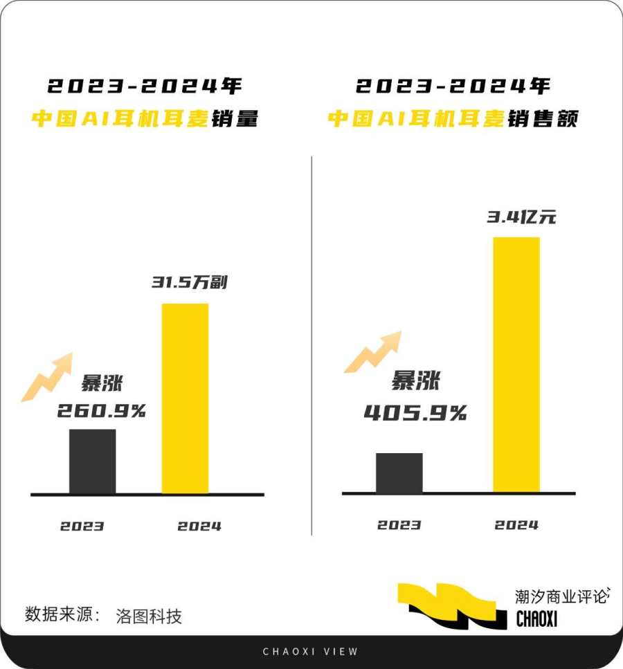 据洛图科技数据显示,2024年中国AI耳机耳麦在传统主流电商平台的销量达到31.5万副,销售额突破3.4亿元,同比2023年分别暴涨260.9%和405.9%。