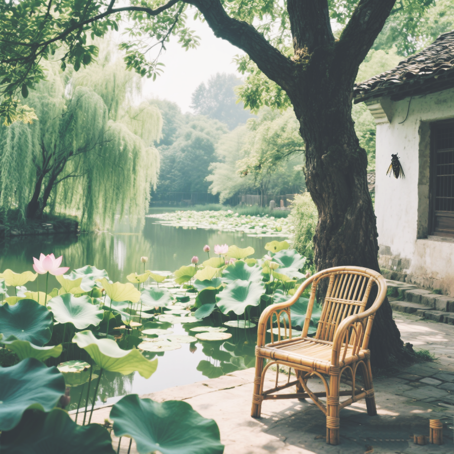 低头看藤椅,深褐色的椅面上有个浅浅的印子,是后背汗湿的痕迹,像个人形的影子。塘边的荷叶不知什么时候舒展开一片,蔫蔫的,却带着点精神。远处的蝉鸣还在继续,但好像没那么刺耳了。空气里似乎多了点水汽的凉。
