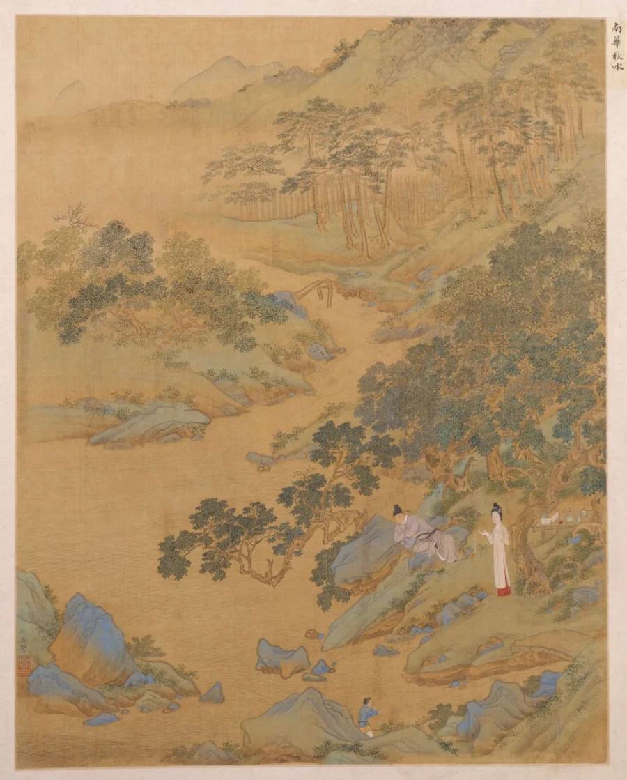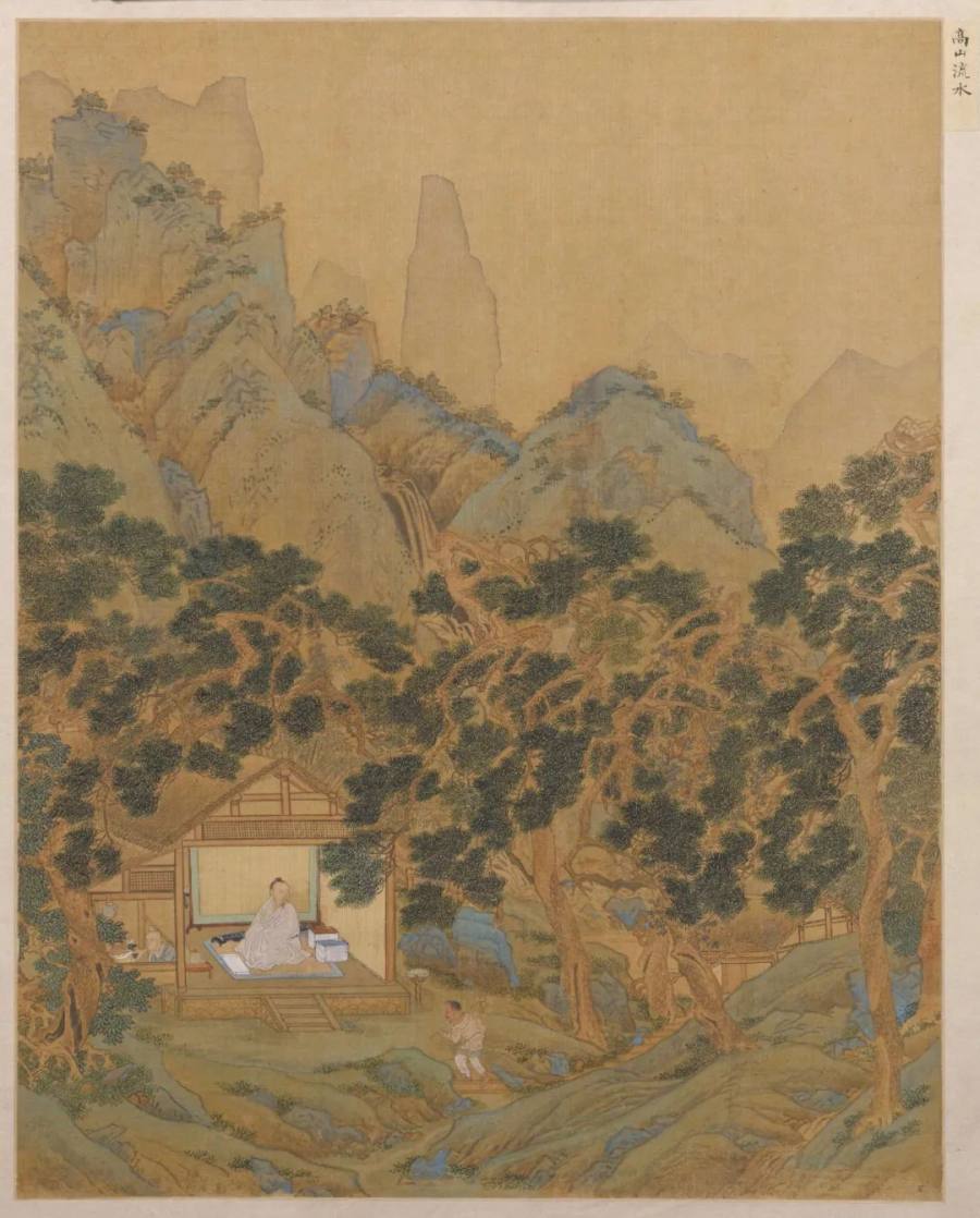 此图收理法与诗情,体兼工谨与灵动。松叶以点厾成密,山石以皴擦成骨,溪涧以淡粉成润;淡金绢地,托出烟岚清气。意象清远,格调雅正;以庭院小景托写山川阔怀,以一琴待音传达文心。高山在目,流水入耳,风度温醇,气脉自通;提笔命名,愿留四字:高山流水。赏至末处,琴心与画心相印。清听可见,静观可闻。意满山房。