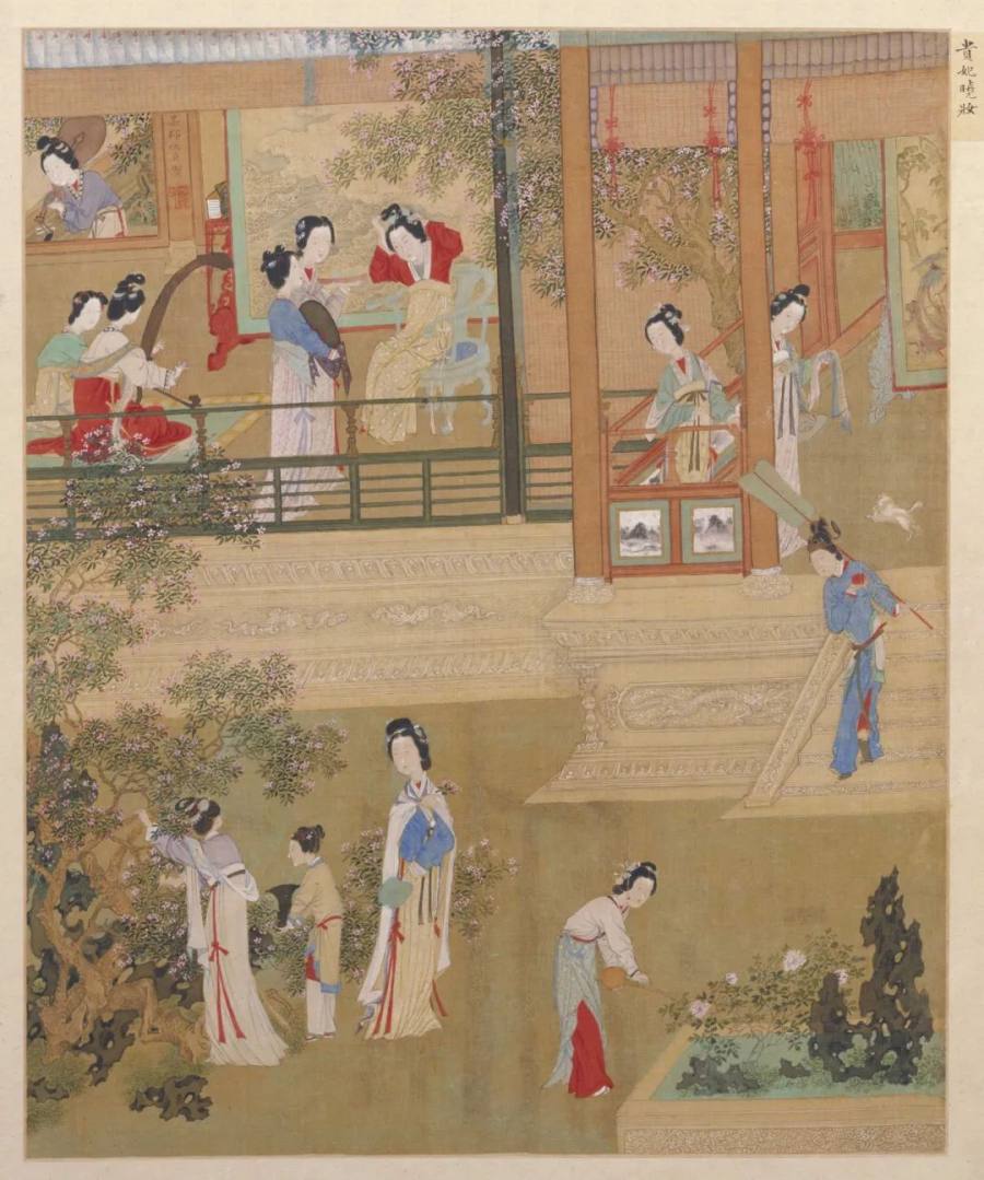晓烟初起,禁苑春深。层楹画栋,罗帷半启。贵妃凭翠椅,鬟侍拂粉,执镜传光,金钿微颤。廊间花影转阶,桃李含红;画屏铺锦,云山隐现。设色精妍,青绿明润;钩勒细密,纨素如新。宫兔跃檐,台阶新扫,香风徐度,晨光透纱,氍毹软暖,绣砌生辉。